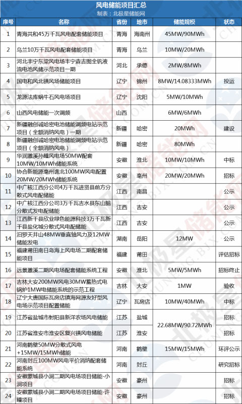 截止目前全國范圍內(nèi)風電配套儲能項目總數(shù)量已達24例,值得注意的是,此次華能新增的項目都位于安徽,而近期河南也開始出現(xiàn)風電儲能項目,詳細見下表。