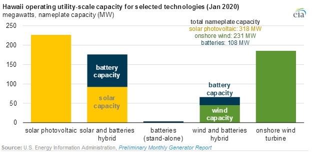 截至2020年1月,夏威夷州總發(fā)電量的30%來自太陽能或風(fēng)力發(fā)電設(shè)施。這些可再生能源發(fā)電設(shè)施的間歇性為電力系統(tǒng)運(yùn)營商帶來了挑戰(zhàn)。事實(shí)證明,將電池儲(chǔ)能系統(tǒng)與風(fēng)力發(fā)電設(shè)施或太陽能發(fā)電設(shè)施配套部署可以有效緩解這種挑戰(zhàn)。夏威夷州計(jì)劃到2045年實(shí)現(xiàn)100%可再生能源發(fā)電目標(biāo)??紤]到實(shí)現(xiàn)這一目標(biāo),風(fēng)力發(fā)電和太陽能發(fā)電將在該州未來的能源結(jié)構(gòu)中占到越來越大的比重。美國能源信息署(EIA)期望部署更多的電池儲(chǔ)能系統(tǒng)以支持這一增長。