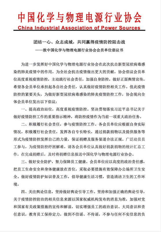 ——致中國(guó)化學(xué)與物理電源行業(yè)協(xié)會(huì)會(huì)員單位倡議書(shū)
