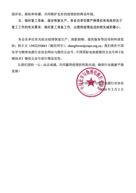 各會(huì)員單位有關(guān)抗擊疫情恢復(fù)生產(chǎn)、捐款捐物、提供服務(wù)等宣傳材料請(qǐng)發(fā)給:程立文 15922250061(微信同號(hào)),chengliwen@ciaps.org.cn。我們將在中國(guó)化學(xué)與物理電源行業(yè)協(xié)會(huì)網(wǎng)站與微信公眾號(hào)、中國(guó)國(guó)際電池展微信公眾號(hào)和《電源技術(shù)》微信公眾號(hào)進(jìn)行推送宣傳。