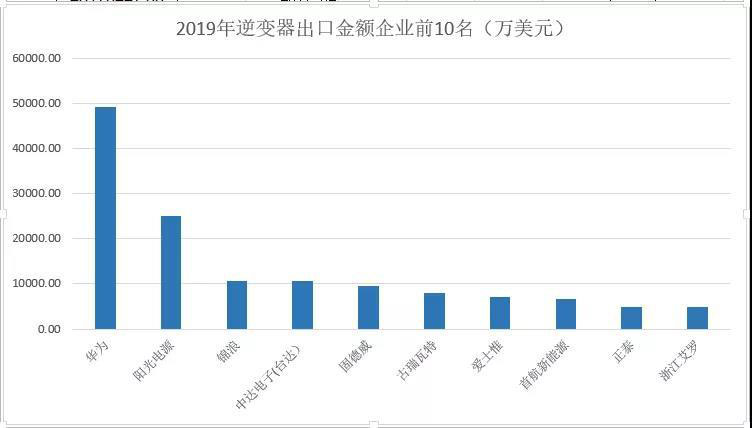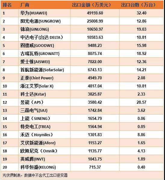 近日,2019年全年的海關(guān)數(shù)據(jù)已出爐,根據(jù)光伏們統(tǒng)計(jì),2019年全年,中國(guó)的逆變器出口量約為3155.47萬臺(tái),出口總金額達(dá)到了近29億美元(含光伏、風(fēng)電、汽車電源等),前20家光伏逆變器公司的出口金額超過了總出口額的50%,約為15.42億美元。其中華為、陽光,錦浪,臺(tái)達(dá),固德威位列2019年出口逆變器企業(yè)前五名。