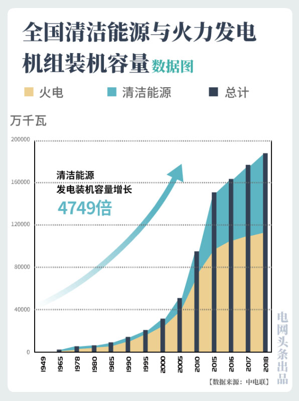 ? 1949年,全國(guó)清潔能源裝機(jī)僅含16萬干瓦,水電占總發(fā)電裝機(jī)容量的8.8%;