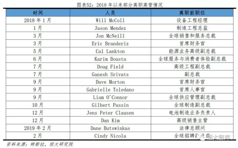 五、高層震蕩頻繁。特斯拉高層離職率呈增長趨勢,僅2018年全年,離職高管超過40人。除正常的人員調(diào)動和行政方面高管離職,特斯拉核心團(tuán)隊的技術(shù)、財務(wù)、研發(fā)、法務(wù)管理人員均發(fā)生過離職,例如2016年5月離職的生產(chǎn)制造副總裁Greg Reichow與Josh Ensign、2017年4月離職的首席財務(wù)官JasonWheeler、2017年7月離職的電池技術(shù)總監(jiān)Kurt Kelty、2018年9月離職的首席人事官Gabrielle Toledano等。即便高管離職跳槽在硅谷科創(chuàng)企業(yè)非常普遍,但是管理層頻繁變動仍不利于特斯拉穩(wěn)健發(fā)展。