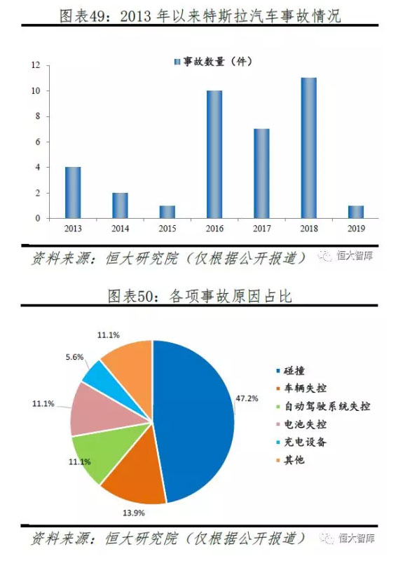 三、安全問題。即便對產(chǎn)品經(jīng)過多次升級、采取各種安全措施,特斯拉汽車事故頻率依然呈上升趨勢,2013年因頻發(fā)的汽車起火事件導(dǎo)致特斯拉股價跌幅最高達(dá)20%。根據(jù)已披露報道,從2013年至2019年3月特斯拉共發(fā)生36起汽車安全事故,47.2%為車輛碰撞導(dǎo)致,其中包括因?yàn)榫岂{、操作不當(dāng)、路障等而造成的碰撞。然而,不同于燃油車,58.8%車輛碰撞引發(fā)電池燃燒,且由于動力電池高燃燒時長,對駕駛員造成不同程度傷害。此外,事故傷亡程度深,36起事故中有9起事故造成人員死亡。