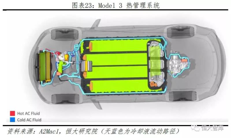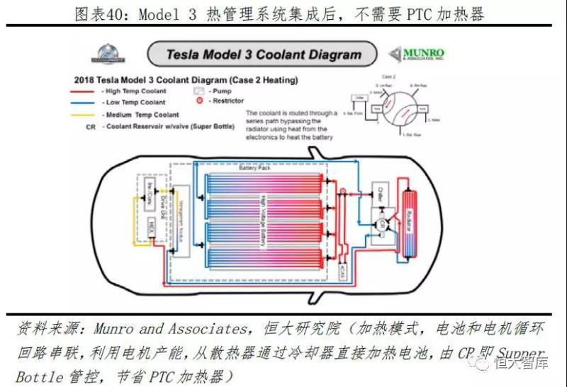 四、熱管理系統(tǒng)溫差設(shè)計合理,冷卻路線豐富流暢,均溫和能量管控能力突出。新能源汽車的熱管理系統(tǒng)主要包括整車、座艙、電池三方面,進(jìn)行整車溫度控制、客艙空調(diào)加熱制冷、電池過熱散熱過冷加熱等。目前,主流熱管理包括自然冷卻、液冷和直冷三種方案,特斯拉采取50%水和50%乙二醇為冷卻液的液冷方案,由四通閥實(shí)現(xiàn)的電機(jī)和電池冷卻循環(huán)串并聯(lián)結(jié)構(gòu)。由系統(tǒng)芯片算法控制,當(dāng)電池溫度超過設(shè)定目標(biāo)值時,電池循環(huán)與電機(jī)循環(huán)相互獨(dú)立,采用并聯(lián);電池溫度低于設(shè)定目標(biāo)值時,電池循環(huán)與電機(jī)循環(huán)采取串聯(lián),利用電機(jī)余熱為電池和座艙加熱,多余熱量將由進(jìn)氣口的熱量交換器排放出去。此方案充分利用車內(nèi)所有部件熱量,使熱量有效循環(huán)游走,極大提高電池單體散熱性和電池單體間溫度一致性。因此,無論冬季還是夏季所對應(yīng)的極端氣候,特斯拉車輛溫差控制保持在2℃內(nèi),體現(xiàn)強(qiáng)大的溫度管控能力。