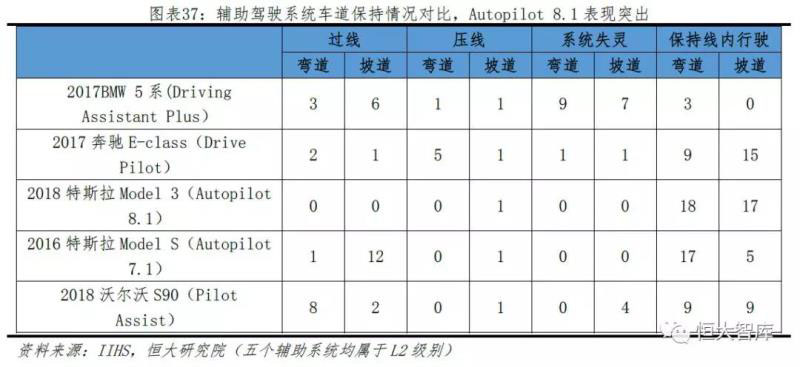 從車道保持情況來看,根據(jù)美國公路安全保險協(xié)會IIHS數(shù)據(jù),在直徑1300-2000英尺(396-617米)不同的空曠道路測試環(huán)境下,對比寶馬5系、奔馳E、Model 3/S和沃爾沃S90五輛同類別轎車,設(shè)定3種情況各6種測試的共18次測試條件,Autopilot8.1輔助駕駛系統(tǒng)在彎道和坡道的車輛保持能力最為突出,僅在坡道表現(xiàn)過一次壓線。