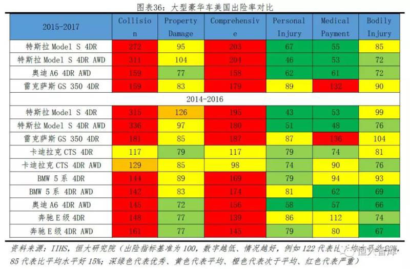 對比同等大型豪華轎車的出險率,從三項車體保護(hù)險來看,特斯拉與其他豪華轎車類似,表現(xiàn)較差,且數(shù)據(jù)遠(yuǎn)遠(yuǎn)高于其他同類型轎車,說明特斯拉單車平均碰撞率高于行業(yè)平均水平,這也暗示由于系統(tǒng)誤判或者駕駛員忽視容易造成更多碰撞。但從三項人體保護(hù)險來看,特斯拉Model S低于平均、基本處于優(yōu)秀水平,說明Model S對自身車主和對方車主有良好的人身保護(hù)。