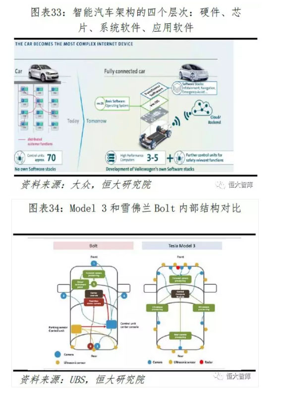 1、特斯拉崛起,重塑汽車產(chǎn)業(yè)競爭格局。1)Model 3 成為爆款:2019年1至11月特斯拉Model 3北美市場的銷量達(dá)到12.8萬輛,超過同級別寶馬2/3/4/5系銷量之和(10.4萬)、奔馳C/CLA/CLS/E系之和(9.5萬)、奧迪A3/A4/A5/A6之和(7萬)。與此同時,通用、福特等傳統(tǒng)車企陸續(xù)裁員,F(xiàn)CA(菲亞特克萊斯勒)和PSA(標(biāo)致雪鐵龍)合并成為全球第四大車企,傳統(tǒng)車企抱團(tuán)取暖與特斯拉的高歌猛進(jìn)形成鮮明對比。2)特斯拉開啟了汽車電動化與智能化浪潮:Model 3不僅在三電的工程技術(shù)層面做了進(jìn)一步改進(jìn),而且采用了類似于智能手機(jī)的集中式電子電氣架構(gòu),即用一個中央處理器和操作系統(tǒng)控制所有車輛上的硬件。未來汽車產(chǎn)業(yè)的核心價值將不再是發(fā)動機(jī)、車身、底盤,而是電池、芯片、車載系統(tǒng)、數(shù)據(jù)。全球最大的車企大眾宣布,將成為一家軟件驅(qū)動的公司,并設(shè)立了“Digital Car&Service”部門,大力推動數(shù)字化轉(zhuǎn)型。豐田公司宣布,豐田將從汽車公司轉(zhuǎn)型為移動出行公司,他們的競爭對手已經(jīng)不是曾經(jīng)的奔馳、寶馬和大眾,而是蘋果、谷歌等。