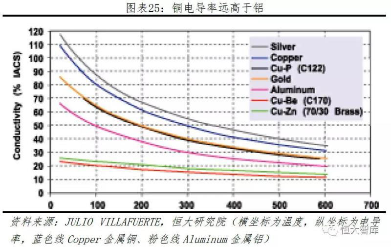 銅較鋁帶來更高的電導(dǎo)效率。從各項金屬不同溫度下的電導(dǎo)率來看,在相同溫度下,銅的電導(dǎo)率遠(yuǎn)高于鋁。如果將電機(jī)轉(zhuǎn)子結(jié)構(gòu)原材料換成銅,電機(jī)工作效率將大大提高。