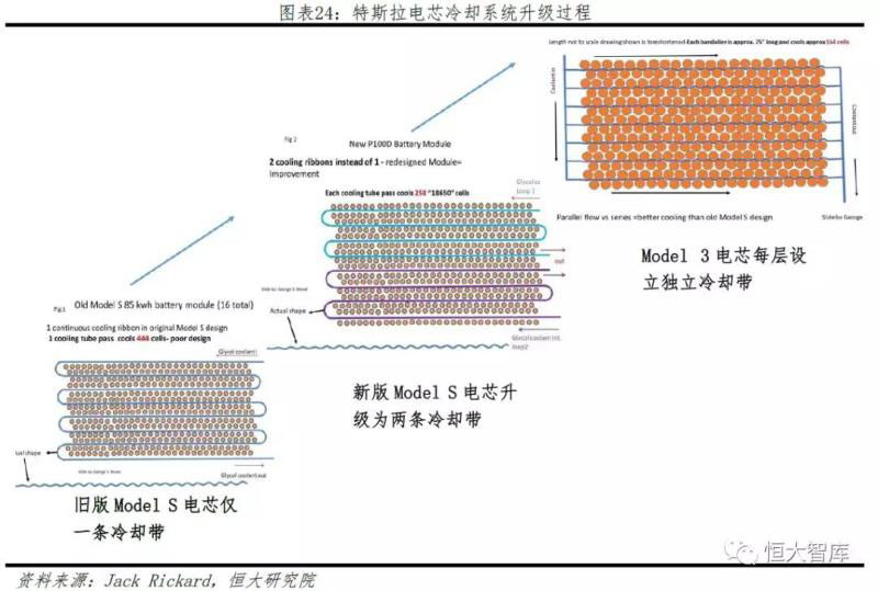 此外,由于電池單體材料升級、體積增大,電芯容量和密度大幅提高,導(dǎo)致電池化學(xué)熱敏感性提升,可燃點(diǎn)從18650電池的約175℃降低為2170電池的約65-82℃,對電池冷卻系統(tǒng)提出更高要求。對比舊版Model S 85、新版Model S P100與Model 3可以發(fā)現(xiàn),電池冷卻系統(tǒng)階段性升級,從早期的單條冷卻帶到如今的每層獨(dú)立冷卻帶,為新版2170電池提供更好的溫度管控,極大提高電池冷卻運(yùn)行效率。
