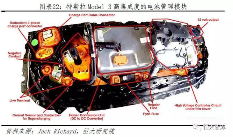 特斯拉的BMS具有兩個特點(diǎn)。一、高精度。根據(jù)Sandy Munro和Jack Rickard等人對Model 3的拆解,Model 3的BMS可以將23-25個獨(dú)立電池組的電壓差控制在2-3mV,遠(yuǎn)低于其他普通電動車的水平;二、高集成度。特斯拉BMS模塊集成了高壓控制器、直流轉(zhuǎn)換器和多個傳感器,由此可以減少內(nèi)部通信所需的高壓線束,最終減輕總重量并降低成本。