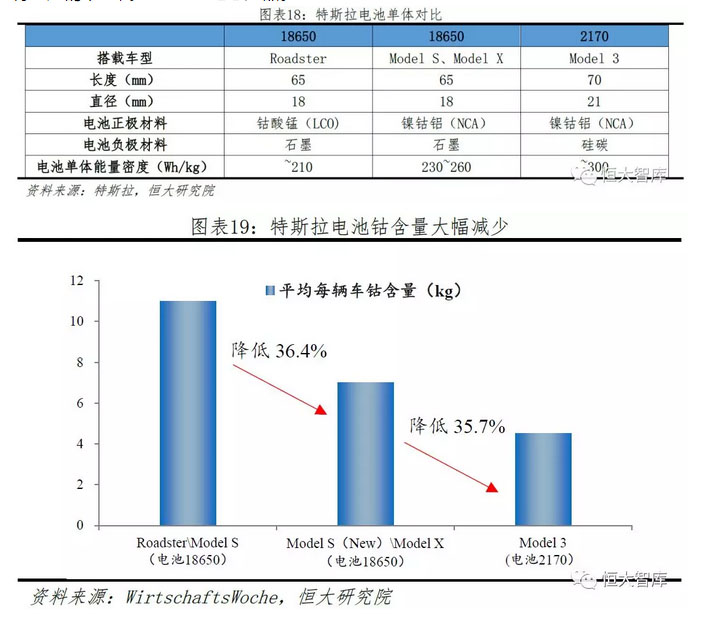一、不斷尋找最優(yōu)材料,降低成本、提升性能。電池單體化學(xué)物質(zhì)成分和比例的不同將直接影響電池性能表現(xiàn),三元材料中,鎳主要作用為提高材料整體能量密度,鈷主要作用為穩(wěn)定材料層狀結(jié)構(gòu),提高整體循環(huán)性能。然而,過高的鎳含量會導(dǎo)致化學(xué)成分不穩(wěn)定,過高的鈷含量會降低能量和容量,并且由于礦產(chǎn)稀缺性,鈷價一直居高不下。為此,特斯拉不斷攻克電池材料配比,試圖找到最優(yōu)方案。橫向來看,當(dāng)競爭對手2013年做磷酸鐵鋰電池與NCM111時,特斯拉已經(jīng)開始在Model S上應(yīng)用高能量密度NCA三元電池;當(dāng)競爭對手2017年開始由低鎳材料過渡到NCM622/NCM811高鎳正極材料時,特斯拉已經(jīng)探索更高能量密度的硅碳負(fù)極應(yīng)用,特斯拉在電池技術(shù)的積累使其電池能量密度和整車?yán)m(xù)航里程能領(lǐng)先競爭對手?jǐn)?shù)個身位??v向來看,特斯拉一直堅持使用NCA作為電芯正極材料,并不斷提高鎳含量、降低鈷含量。對比最新Model 3與Roadster兩款汽車,特斯拉平均每款車鈷含量降低約60%。根據(jù)特斯拉2018年一季度報告,Model 3的電芯能量密度超過其他任何一款競品所使用的電芯,其鈷含量低于主流電芯制造廠即將量產(chǎn)的下一代NCM811電芯產(chǎn)品。