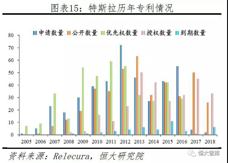 美國專利分析公司Relecura數(shù)據(jù)顯示,截止2018年,特斯拉共計專利/專利族408件。從歷年情況來看,2009年后,專利申請數(shù)量與授權(quán)數(shù)量開始激增,主要與Model S的研發(fā)準(zhǔn)備有關(guān),申請數(shù)量于2012年到達(dá)頂峰,授權(quán)數(shù)量于2013年到達(dá)頂峰。從申請國家來看,美國申請數(shù)量保持領(lǐng)先,近年來歐洲與中國申請數(shù)量急速增加,這與特斯拉全球化的市場戰(zhàn)略分不開。