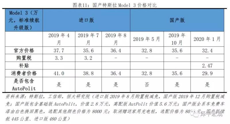 國產(chǎn)Model 3以低價策略攪動內(nèi)地新能源汽車市場。作為國際化的重要戰(zhàn)略之一,特斯拉高度重視內(nèi)地新能源汽車市場,并于上海自建超級工廠,由于國內(nèi)人工費(fèi)用、固定資產(chǎn)費(fèi)用較低,且上海市政府以貸款優(yōu)惠政策吸引,特斯拉上海工廠的資本開支較美國工廠低65%。國產(chǎn)特斯拉將降價切入中高端市場,入門級Model 3價格低于30萬元,并于2019年底完成首批員工交付。此次調(diào)價由三方面組成,第一方面,1月3日特斯拉官方宣布準(zhǔn)續(xù)航升級版從35.58萬元下調(diào)至32.38萬元,降價幅度高達(dá)3.2萬元。第二方面,于2019年12月6月入選第11批《新能源汽車推廣應(yīng)用推薦車型目錄》,享受補(bǔ)貼24,750元/每輛。第三方面,于12月27日入選第29批《免征車輛購置稅的新能源汽車車型目錄》,享受購置稅減免。三方面因素促成Model3入門價格從35.58萬元下降至29.9萬元,對比2019年4月進(jìn)口版本,降價幅度高達(dá)38.8%。