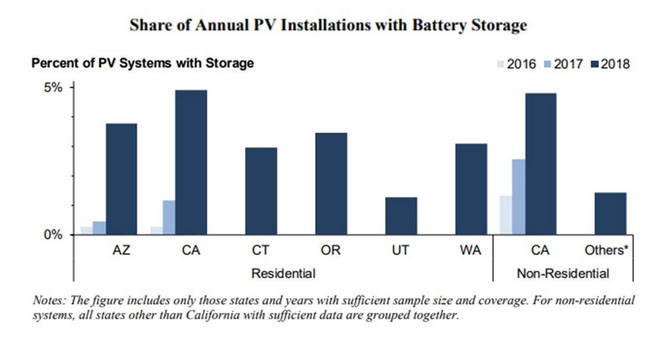 不過,勞倫斯·伯克利國家實(shí)驗(yàn)室(LBNL)的調(diào)查發(fā)現(xiàn),分布式太陽能與電池儲能系統(tǒng)配套部署比例雖然很小,但在不斷增加。主要市場去年的部署量從1%到5%不等,但在夏威夷的部署超過了60%。其驅(qū)動因素包括儲能系統(tǒng)成本下降、客戶尋求可靠性以防電力中斷,以及提供新的公用事業(yè)政策激勵(lì)措施等。