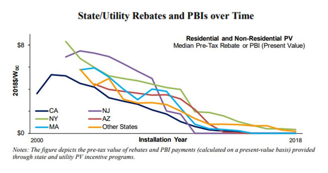 勞倫斯·伯克利國家實(shí)驗(yàn)室(LBNL)的調(diào)查表明:“自2000年以來,太陽能發(fā)電設(shè)施裝機(jī)成本每年下降0.5美元/W,但是,這已經(jīng)被相應(yīng)的折扣或其他激勵(lì)措施所抵消?!?