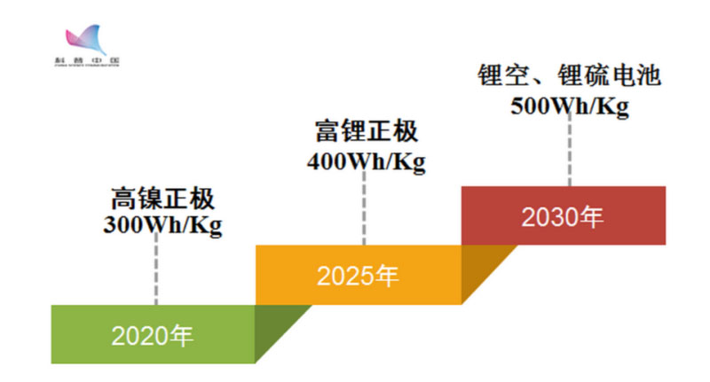 國務(wù)院頒發(fā)的《中國制造2025》提出2020 年動力電池能量密度要達到 300 Wh/Kg,2025 年達到 400 Wh/Kg,2030 年能量密度達到 500 Wh/kg。目前量產(chǎn)動力電池單體能量密度在 230±20 Wh/Kg,根據(jù)《中國制造2025》的要求,結(jié)合現(xiàn)在的技術(shù)路線,我國的科技工作者提出了使用高鎳正極+準固態(tài)電解質(zhì)+硅碳負極實現(xiàn) 300 Wh/Kg的目標;2025 年使用富鋰正極+全固態(tài)電解質(zhì)+硅碳/鋰金屬負極電池實現(xiàn) 400 Wh/Kg的目標,2030年使用鋰空氣電池、鋰硫電池達到500 Wh/Kg的目標。