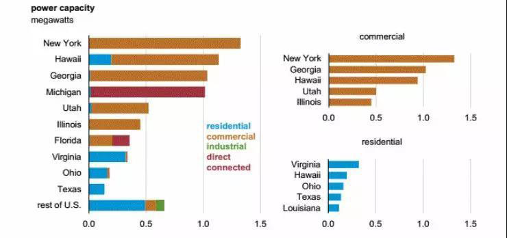 除加利福尼亞州外,擁有小型儲能容量的州還有紐約、夏威夷和喬治亞州,其中大部分容量安裝在商業(yè)部門,如圖8所示。