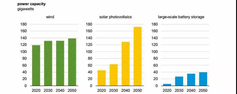 圖7. 美國大規(guī)模風(fēng)能、太陽能和電池容量預(yù)測(2020—2050年)