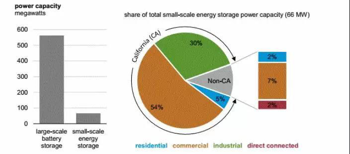 2016年,美國公用事業(yè)公司報告了66兆瓦的小型儲能容量。超過60%的電力裝在商業(yè)部門,31%裝在工業(yè)部門。
