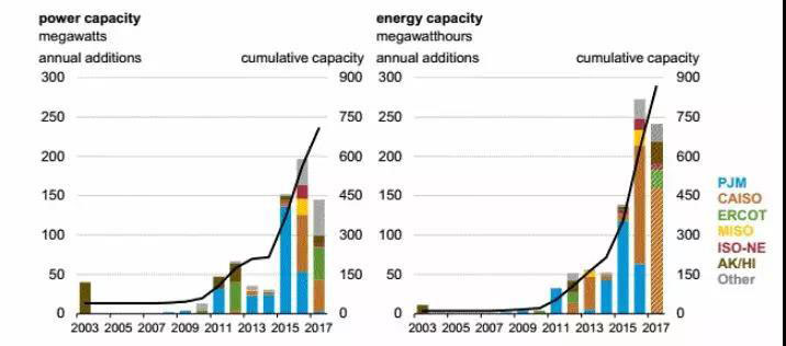 圖3. 按地區(qū)劃分的美國大型電池儲能容量(2003—2017)
