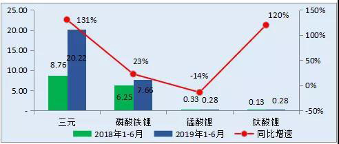 從不同電池類型來看,2019上半年三元電池裝機電量約20.22GWh,同比增長131%;磷酸鐵鋰電池裝機電量約7.66GWh,同比增長23%;錳酸鋰電池裝機電量約0.28GWh,同比下降14%;鈦酸鋰電池裝機電量約0.28GWh,同比增長120%,其余部分為未標(biāo)明具體類型的鋰離子電池。