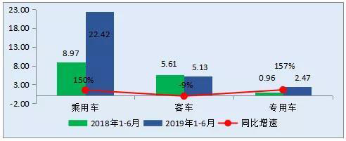 從車輛細分類別來看,2019上半年新能源乘用車電池裝機電量約22.42GWh,同比增長150%;客車電池裝機電量約5.13GWh,同比下降9%;專用車電池裝機電量約2.47GWh,同比增幅最大,高達157%。