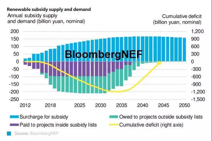 如果只考慮列入目錄的項目,補貼資金有望在3年內(nèi)能實現(xiàn)盈余。然而,據(jù)BNEF估算,如果將在目錄之外的項目也考慮在內(nèi),補貼缺口在今年年底將升至2280億元(332億美元)。到2035年,所有項目累計補助資金缺口將會擴大至1.4萬億元(約2030億美元),隨后逐漸減小。