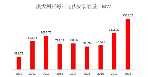 可再生能源中太陽能表現(xiàn)亮眼,光伏安裝容量再創(chuàng)新高。2018年,太陽能發(fā)電量達(dá)到117億千瓦時,占可再生能源發(fā)電量的24%。澳大利亞清潔能源監(jiān)管中心(CER)證實(shí),到2018年12月,已經(jīng)有2百萬戶家庭安裝了屋頂光伏。也就是說每5戶澳大利亞住宅就有1戶安裝了屋頂光伏。在工商業(yè)領(lǐng)域,屋頂光伏增長了45%;住宅領(lǐng)域,屋頂光伏增長了43%。2018年澳大利亞太陽能光伏發(fā)電新增容量達(dá)到1.55GW。澳大利亞現(xiàn)行的高昂電價(jià)被認(rèn)為是屋頂光伏高速發(fā)展的動力源泉。