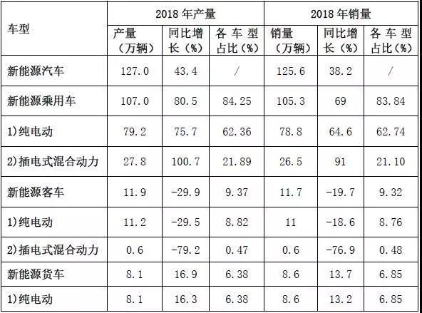 2018年我國新能源汽車全年累計產(chǎn)量127萬輛、銷量125.6萬輛,占汽車整體銷量的4.5%,比去年同期增長61.7%。其中,新能源乘用車全年累計銷量105.3萬輛,純電動車占據(jù)了約75%的份額;新能源客車和貨車的銷量幾乎全部來自純電動車。