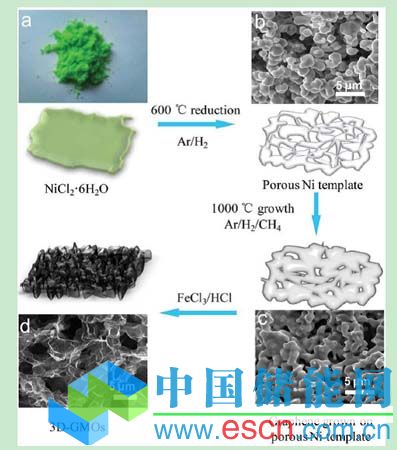中國儲能網訊:三維石墨烯由于其獨特的三維結構,優(yōu)異的物理性質與潛在應用迅速引起廣泛關注。CVD法制備的三維石墨烯由于具有高的比表面積、優(yōu)異的導電性和多孔結構,成為目前石墨烯相關材料最為熱門的材料之一。而三維石墨烯的最近報道都是基于泡沫鎳生長的三維石墨烯及其復合物研究,而且泡沫鎳制備的三維石墨烯密度低孔隙率大,限制了其力學強度及實際應用。因此,發(fā)展簡單快速的制備高密度三維石墨烯的方法及其應用顯得尤為重要。