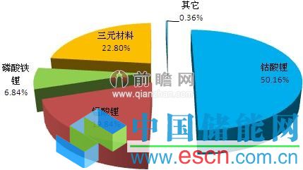 前瞻產(chǎn)業(yè)研究院發(fā)布的《2013-2017年中國鋰電池正極材料行業(yè)發(fā)展前景與投資預(yù)測分析報告》研究顯示,從我國鋰電池正極材料細(xì)分產(chǎn)品結(jié)構(gòu)來看,我國鈷酸鋰的市場份額較大,占比達(dá)到50.16%;其次是三元材料,市場份額為22.80%;錳酸鋰位居第三,市場份額為19.84%;磷酸鐵鋰的市場份額為6.84%,位居第四。