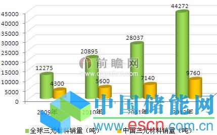 從三元材料銷量來看,全球及中國市場的三元材料銷量均呈現(xiàn)快速增長趨勢,2011年全球三元材料銷量為2.8萬噸,中國市場銷量為7140噸,2012年全球三元材料銷量增加至4.4萬噸,中國市場銷量增加至9760噸。