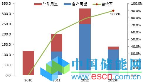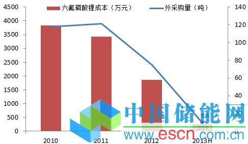 目前天賜材料生產(chǎn)的電解質(zhì)僅供自己使用,2013年上半年的外部采購量僅為9.6噸,較2011年減少92.1%,基本實(shí)現(xiàn)自給自足。
