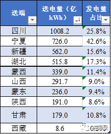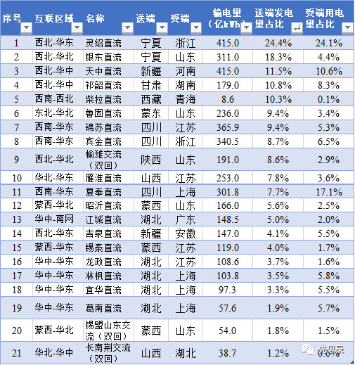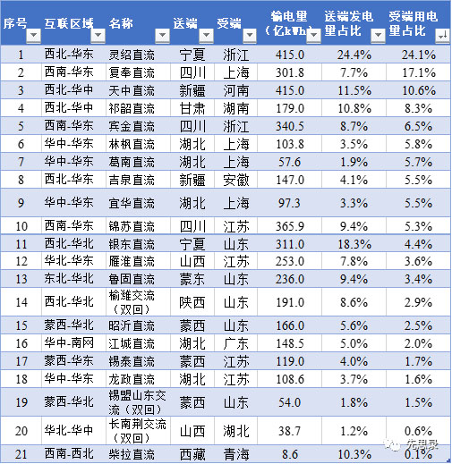 下表給出了主要跨區(qū)輸電工程按照送端發(fā)電量占比排序情況,其中,蒙西、蒙東地區(qū)按照各自營(yíng)業(yè)區(qū)域統(tǒng)計(jì);送端發(fā)電量占比沒(méi)有考慮送端省份線損。
