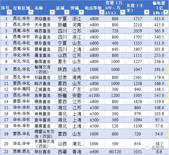2019年,西北、西南和東北區(qū)域向華北、華東和華中負(fù)荷中心跨區(qū)輸電量分別達(dá)到2026、1062和541億千瓦時(shí),相當(dāng)于為負(fù)荷中心減排28947萬(wàn)噸二氧化碳。其中,跨區(qū)輸電工程發(fā)揮了重要作用。下表給出了其中主要跨區(qū)輸電工程2019年的輸電情況。