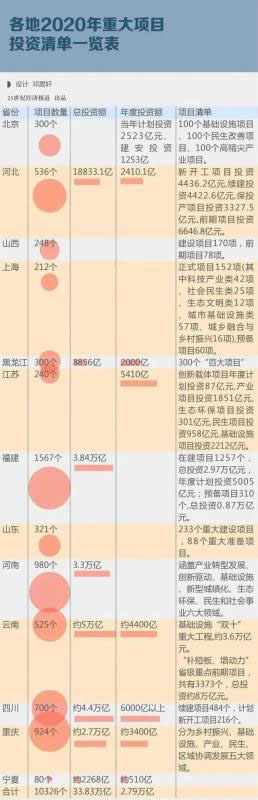 這份投資清單共包括10326個(gè)項(xiàng)目,絕大多數(shù)為基建項(xiàng)目,其中8個(gè)省份公布了計(jì)劃總投資額,共計(jì)33.83萬(wàn)億元。