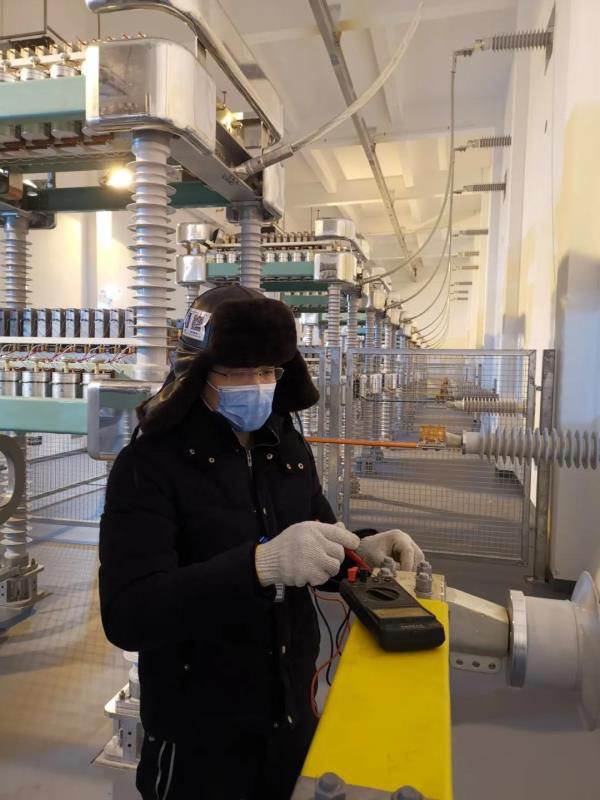 張北柔直工程張北換流站林宇龍對(duì)系統(tǒng)調(diào)試前接觸電阻開展測(cè)量工作。喬平 攝