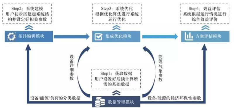 CloudIEPS包含四大模塊,分別是數(shù)據(jù)管理模塊、 拓?fù)渚庉嬆K、集成優(yōu)化模塊和方案評(píng)估模塊,通過(guò)流程化設(shè)計(jì)引導(dǎo)用戶(hù)快捷操作,各模塊相互配合協(xié)作,共同完成綜合能源系統(tǒng)的規(guī)劃設(shè)計(jì)。